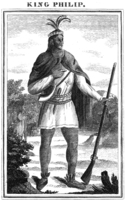 Phillip [sic] alias Metacomet of Pokanoket Portrait of King Philip or Metacom, a native American, holding a gun or musket. In the background native Americans smoke a pipe. Cultural artifacts include beaded wampum belt, powder horn, feathered headdress, knife, and moccasins.